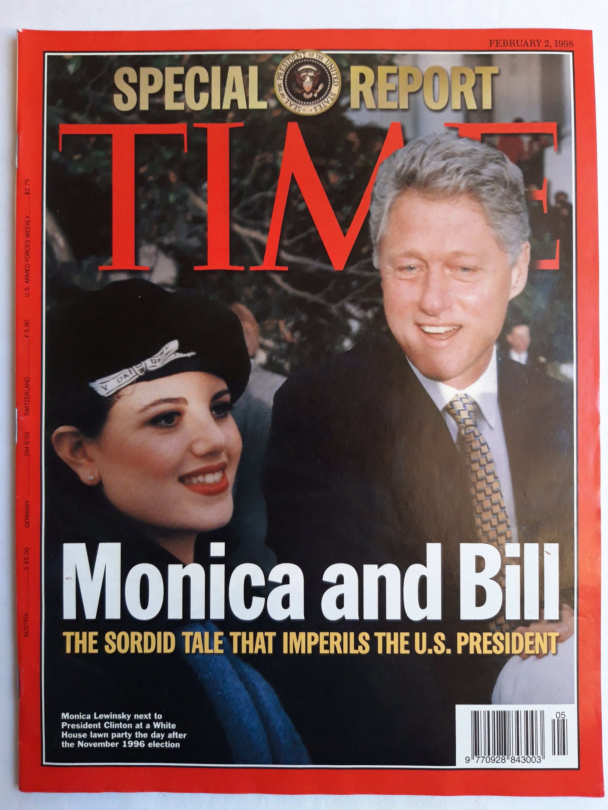 Time magazine Special Report Monica Lewinsky and Bill Clinton White HouseLawn Party The Day After The November 1996 Election The Sordid Tale that Imperils The U.S. President 02.02.1998 Februar 1998
